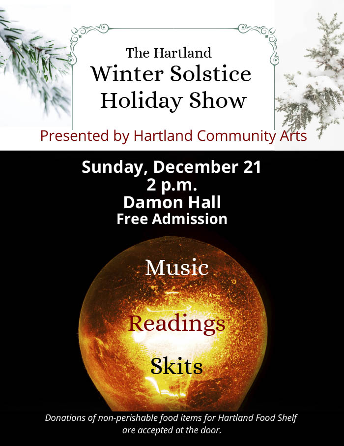 None of us on the current Board participated years ago when HCA mounted its legendary variety shows. Some of us learned only recently, that HCA fundraised for the original stage lights, the grand piano, the curtains, and the projector screen, and that it mobilized volunteers to paint the interior walls of Damon Hall. What we do know is that today Hartland is a town with a lot of community spirit, thanks to the activities of many community groups, such as HCA. We are working to ensure that Hartland will continue to enjoy the community theater into the future by purchasing additional theatrical lights, and this fundraiser surely will help us achieve that goal. The arts may not fill potholes, but who knows what they may fill?